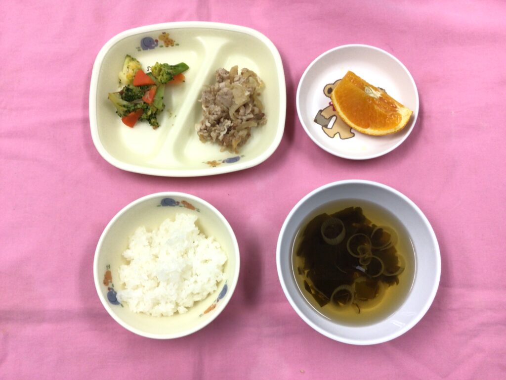 <給食> ご飯 すまし汁(長葱・わかめ) 豚肉のみそ炒め ブロッコリーなめ茸和え オレンジ