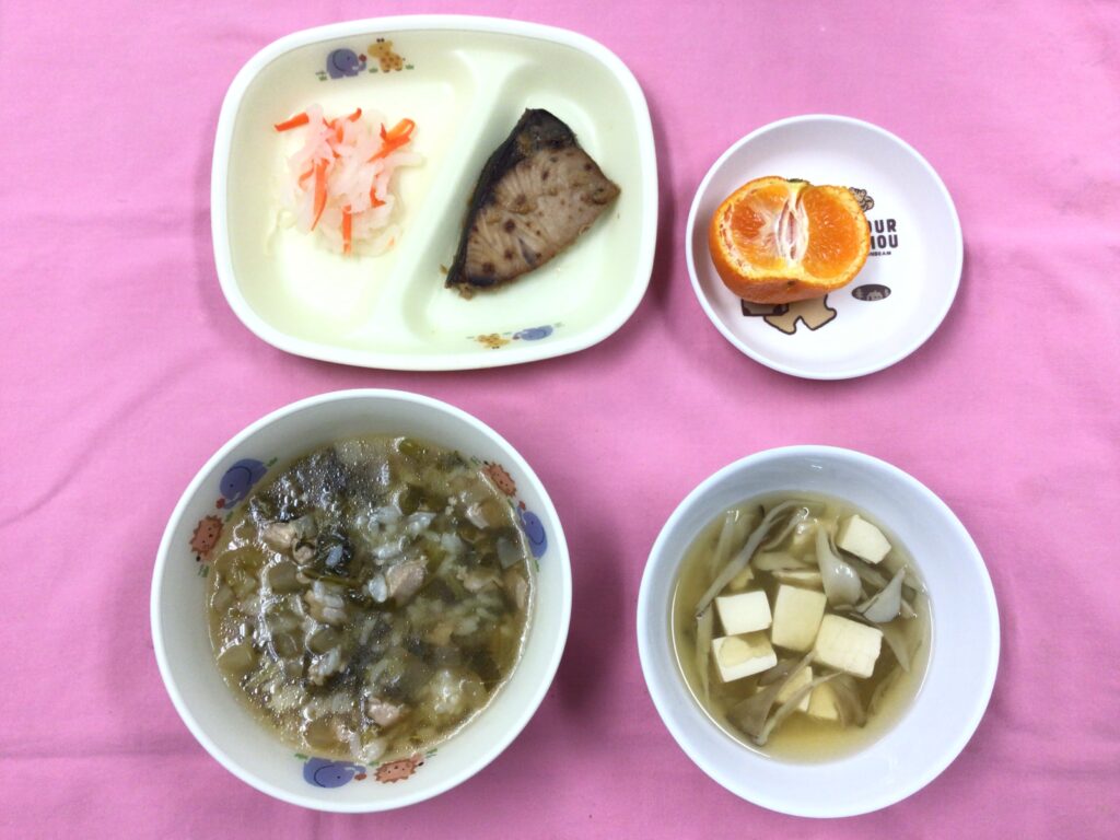 <給食> 七草かゆ 味噌汁(豆腐・舞茸) ぶりの照り焼き 紅白なます みかん