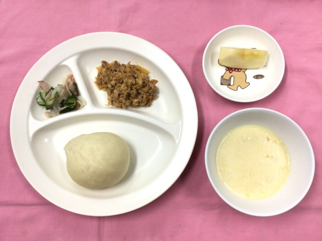 <給食> 白パン コーンポタージュ 豚肉のケチャップ炒め ハムとかぶのさっぱりサラダ りんご