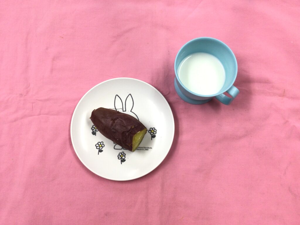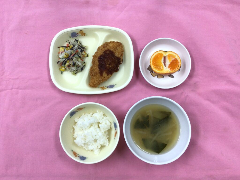 <給食> ご飯 味噌汁(小松菜・もやし) 白身魚のフライ(カレイ) ひじきサラダ みかん