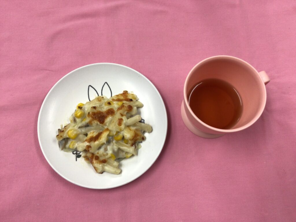 <おやつ> チキンマカロニグラタン 麦茶