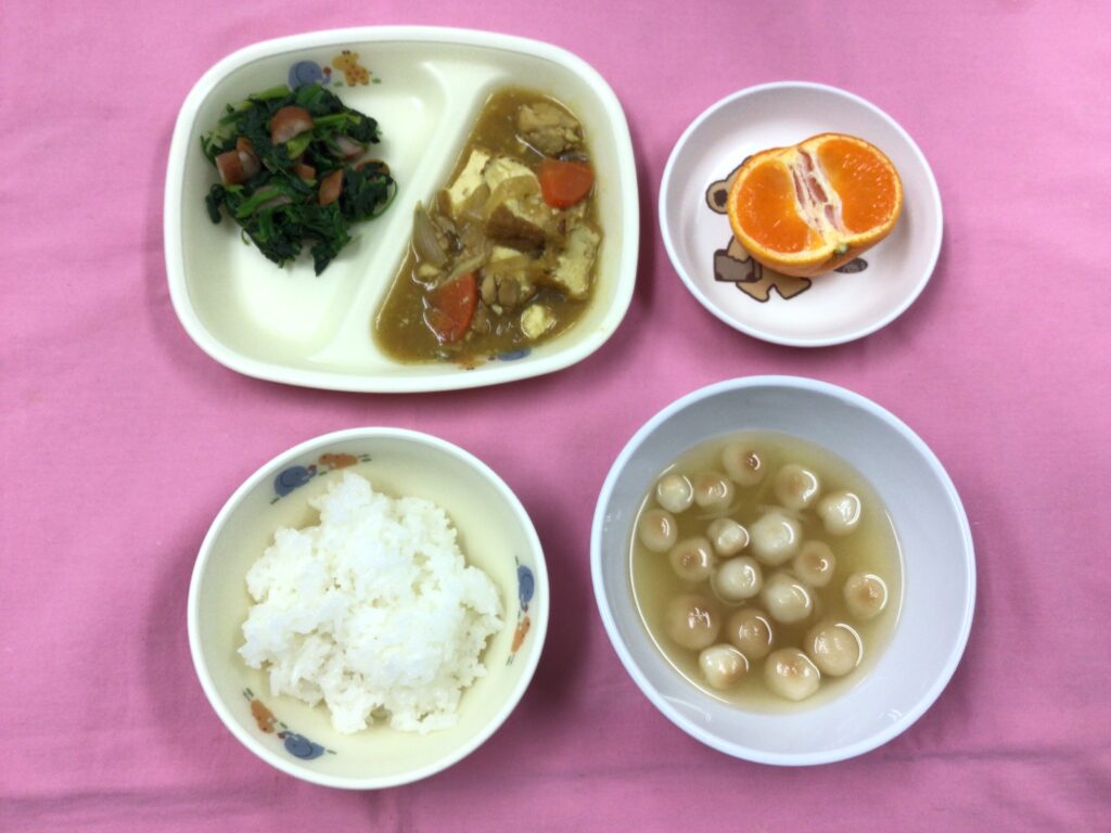 <給食> ご飯 味噌汁(お麩・長ねぎ) 厚揚げのカレー煮 ほうれん草とウインナーの和え物 みかん