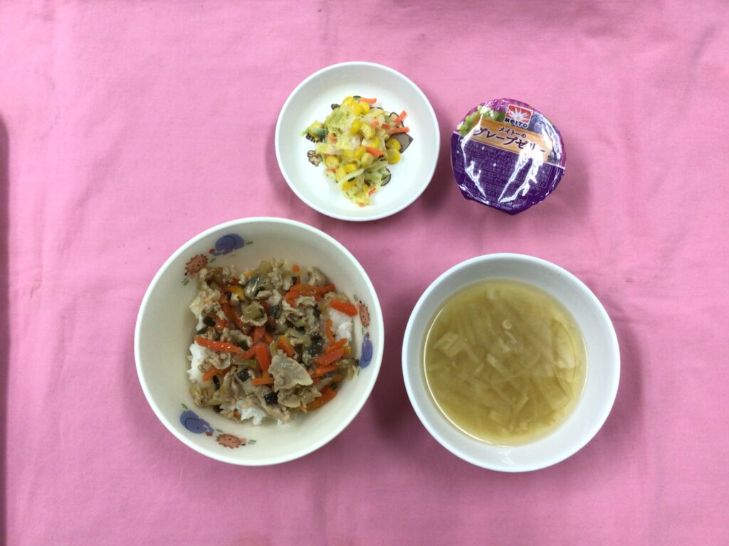 <給食> 豚丼 味噌汁(大根・玉ねぎ・えのき) コールスローサラダ ぶどうゼリー