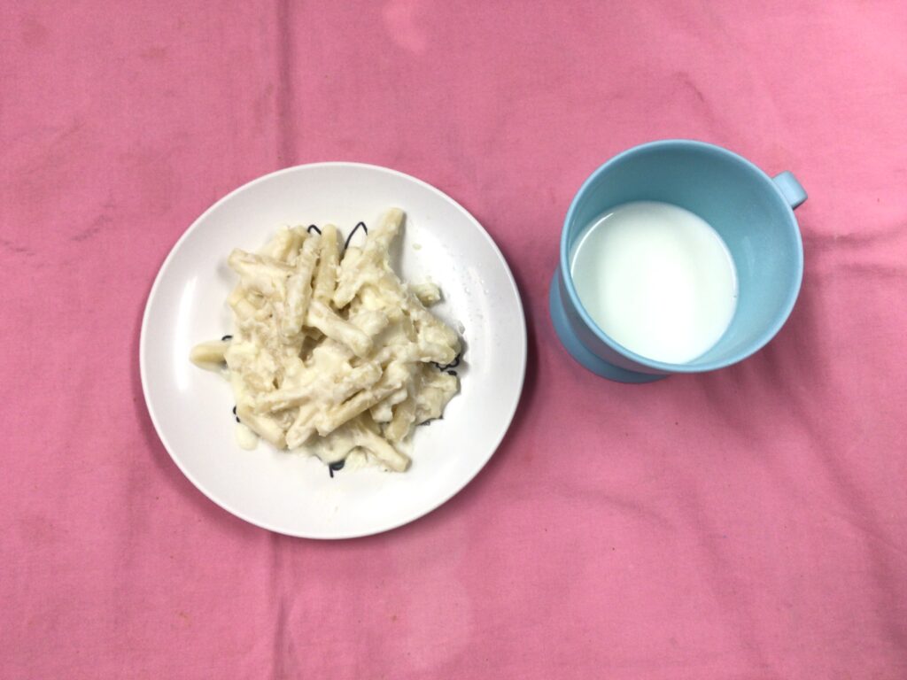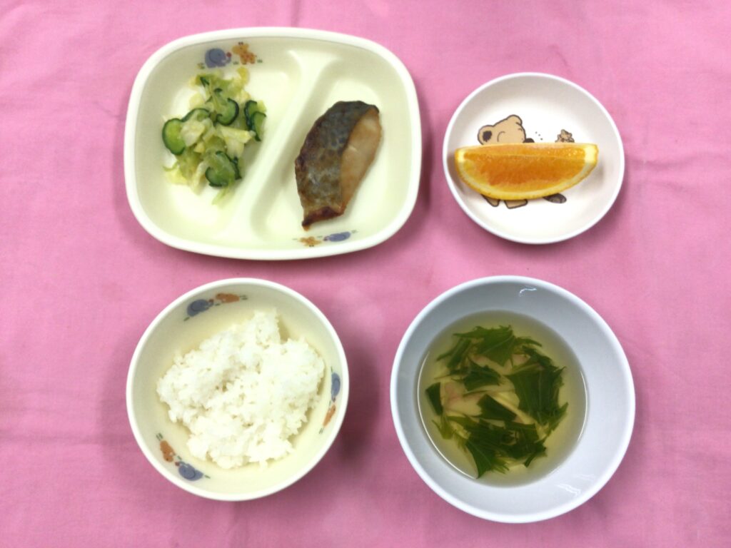 <給食> ご飯 すまし汁(かまぼこ・水菜) さわらの味噌照り焼き キャベツと胡瓜の旨塩和え オレンジ