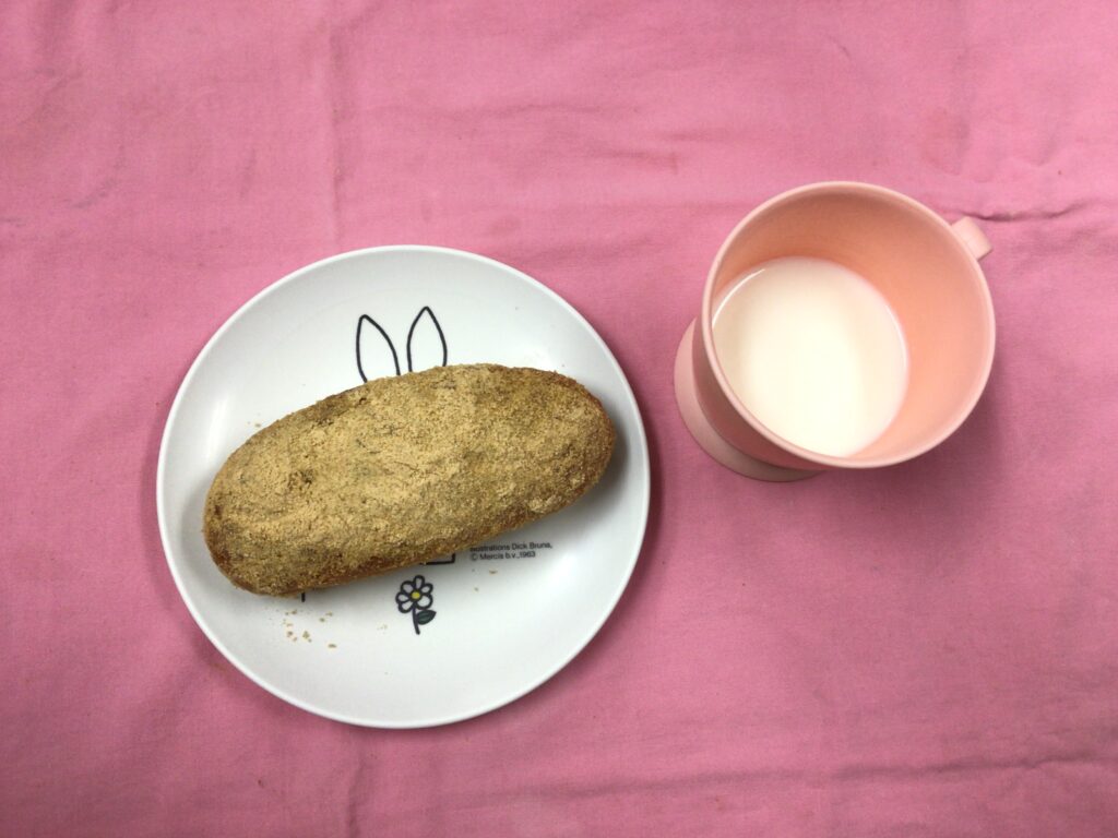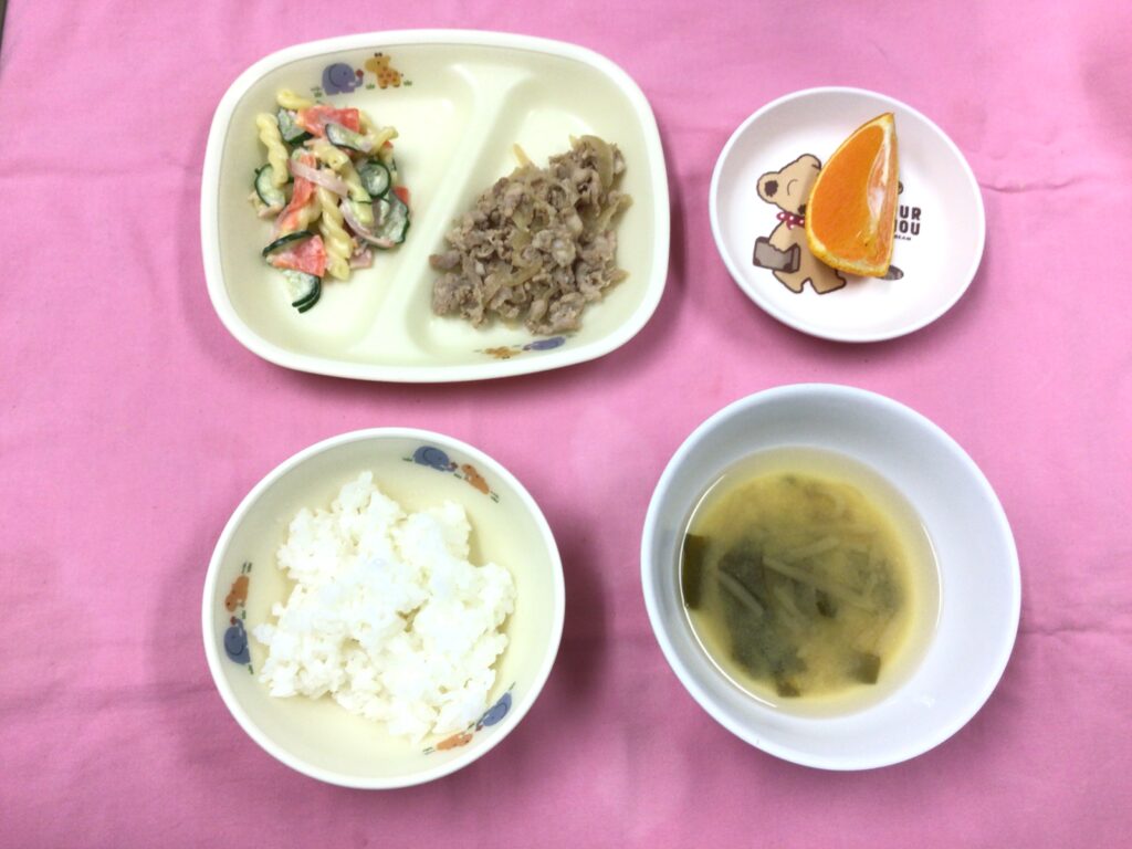 <給食> ご飯 味噌汁(もやし・わかめ) 豚肉のしょうが焼き マカロニサラダ でこぽん
