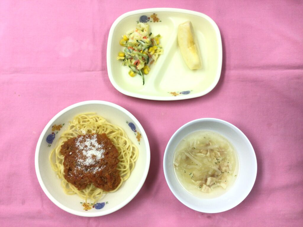 <給食> ミートソーススパゲッティ オニオンスープ コールスローサラダ りんご