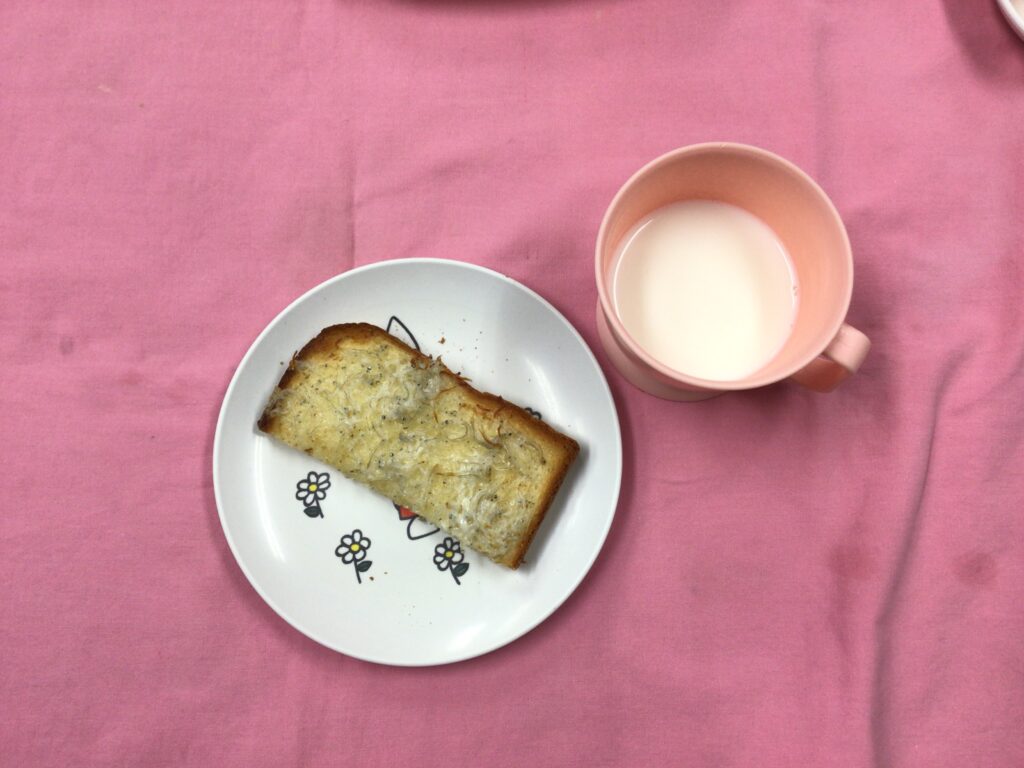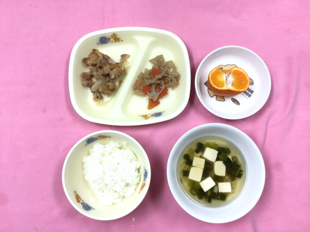 <給食> ご飯 すまし汁(豆腐・えのき・あさつき) 鶏の梅みそ焼き れんこんの金平 みかん